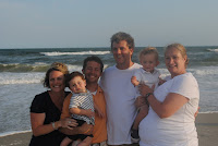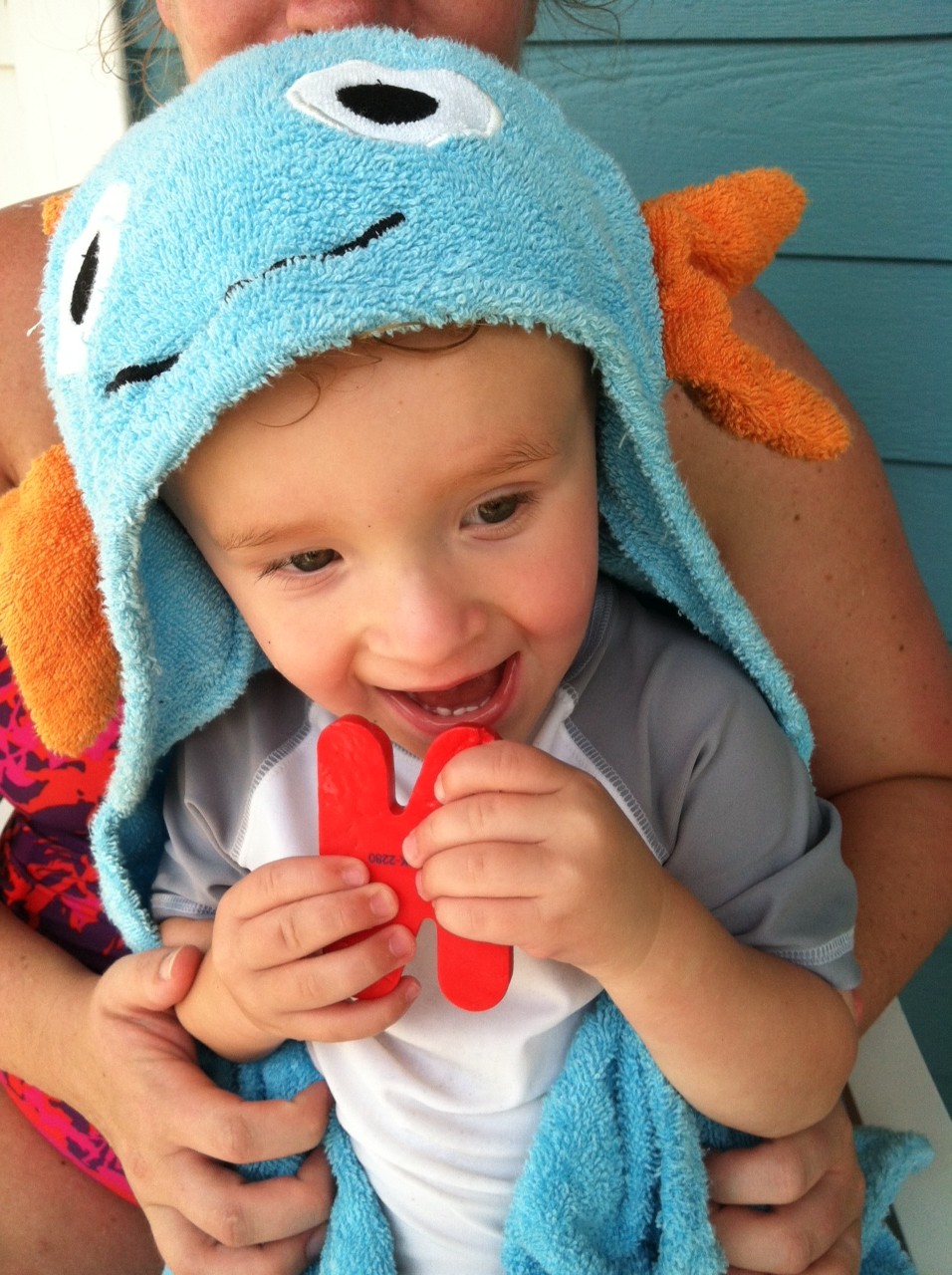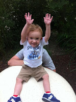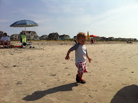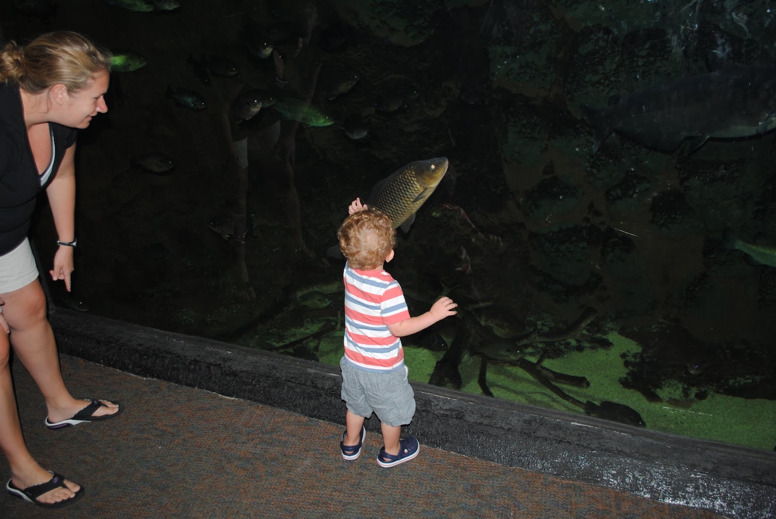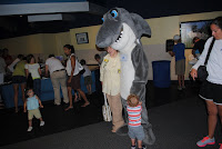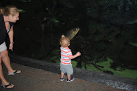 The aquarium was great too, we went one day at the beach to get a break from the sun.  He would chase the fish around through the glass walls, and he loved the giant shark mascot.  Speaking of the beach, it was a little hit and miss :)  He liked it, but was a little scared too.  He may be more of a pool man!  He still had his moments though, splashing in the waves if you were right with him.  The funniest thing about it were the dogs.  The Woo Woo as Cade calls them.  He would chase them around the beach, petting them, kissing them, loving it.  And of course the dogs loved the attention too.  So when we left he kept asking for the Woo Woo, and we told him they had to go bye bye.  This morning still, he looks up and says "woo woo gone"  in a sad and determined voice.  Most of you know I am not a big animal guy, but dang if I might have to get a dog now.
