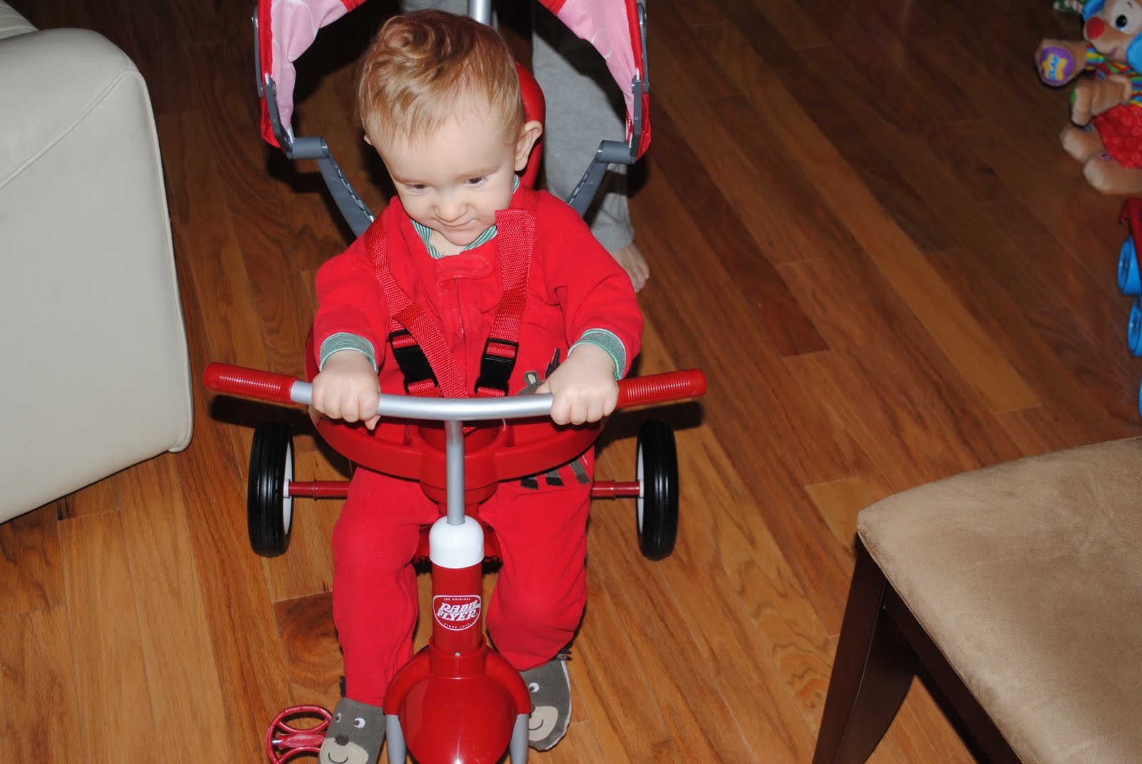 Cade loves to swing. We go down to the swings in the neighborhood and he hangs on for dear life and laughs his little self to death. It is a great way to get out of the house, we will really miss it this winter when it is too cold. But, he loves to play in his walker even more. He is a speed demon in that thing, going all over the place. One great thing is to take him to the gym at Cardinal Gibbons on a Saturday and let him tool around the gym floor. He will do it for an hour, and get worn out in the process :) We actually bought one because of how he love it in Target!