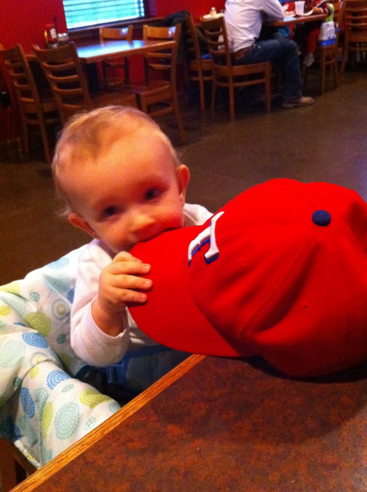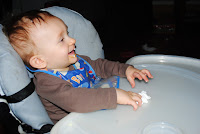 Cade loves the playground too, swings, the bridge, eating the wood chips on the ground; you name it, he loves it.  We have also graduated to all real food, which is great.  Fries, nuggets, pancakes, waffles, bananas, grapes, cheese bread, and more.  It is nice to be able to go out and get him something off the menu, not worry about bottles.