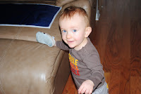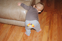 My little buddy is getting more and more brave with his walking too.  He used to "scoot" around the couch and what not; now he will let go, turn around and take 4-5 steps on his own towards you...or towards anything he deems worthy of his attention.  And let me tell you, if he deems it worthy, you are best suited to move and let him have it, lest you get reprimanded by him.  It is so neat to see him taking steps...I remember holding him as a little 9 pound peanut, now he is laughing and jabbering, and walking around.