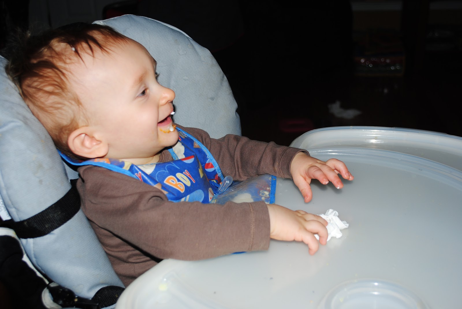 Teeth. Are these things never ending? I think he has been teething for months now. He now has a full grill up top and 3 on bottom. He puts them to good use though, loves to chomp on stuff. And loves big people food. Biscuits, jelly, butter beans, bananas, pancakes, oranges, yogurt, these are all favorites. Not to mention the Gerber puffs, he will hammer those things left and right.