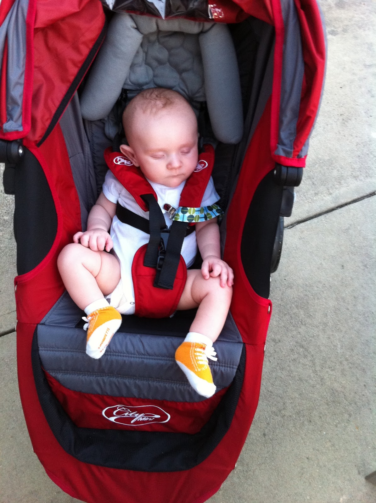 Cade loves to be outside. We walk pretty much every day in either the regular stroller, the jogging stroller or the baby bjorn, he is always a fan. Funny story - We went for a walk a couple weeks ago to the store, about a mile and a half away. Jess said we shouldn't do it because it was going to rain. I said, nah, we will make it back in plenty of time. We did not make it. It started drizzling on the way, and by the time we got ready to leave? Pouring cats and dogs. So, I had to run home, get the car, and drive back to pick them up. Lesson? Listen to the wife and check the radar.