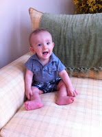 Teeth - man oh man, that was a rough couple weeks! But now, we are all good and he loves munching on cheerios, rice, potatoes, all kinds of stuff. It is great to see him try new things. Oddly enough, he loves lemons, loves them. He will attack it for a few seconds and then his whole body shakes because it is so sour, then he goes right after it again. Quite funny to watch.